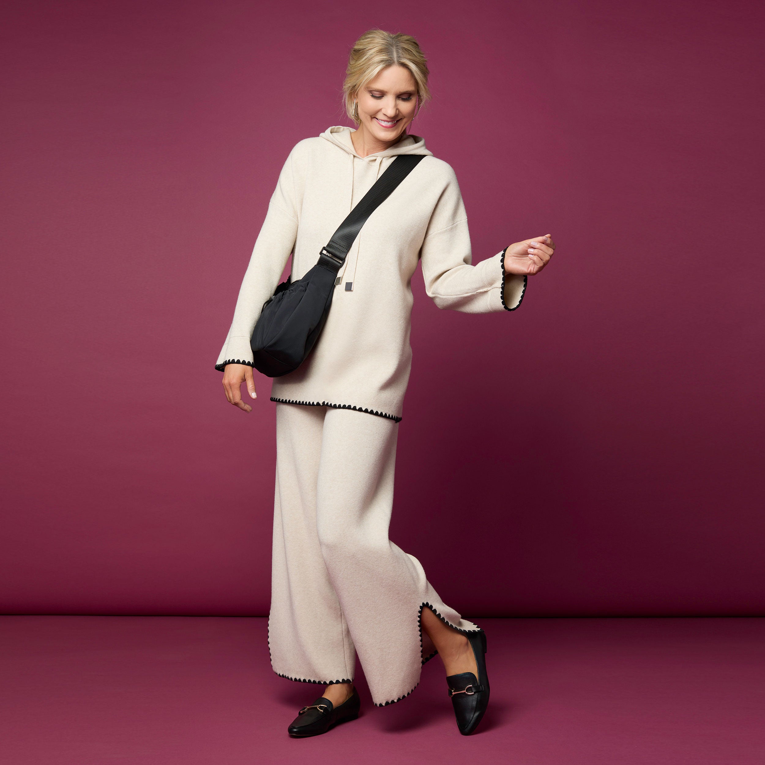 Indulge in ultimate comfort this winter with our Heavenly-Luxe Contrast Trim Sweater Pant. Made from ultra-soft spun yarn fabric, these cozy pants will keep you warm and stylish. Experience softness redefined with these must-have fall fashion staples.