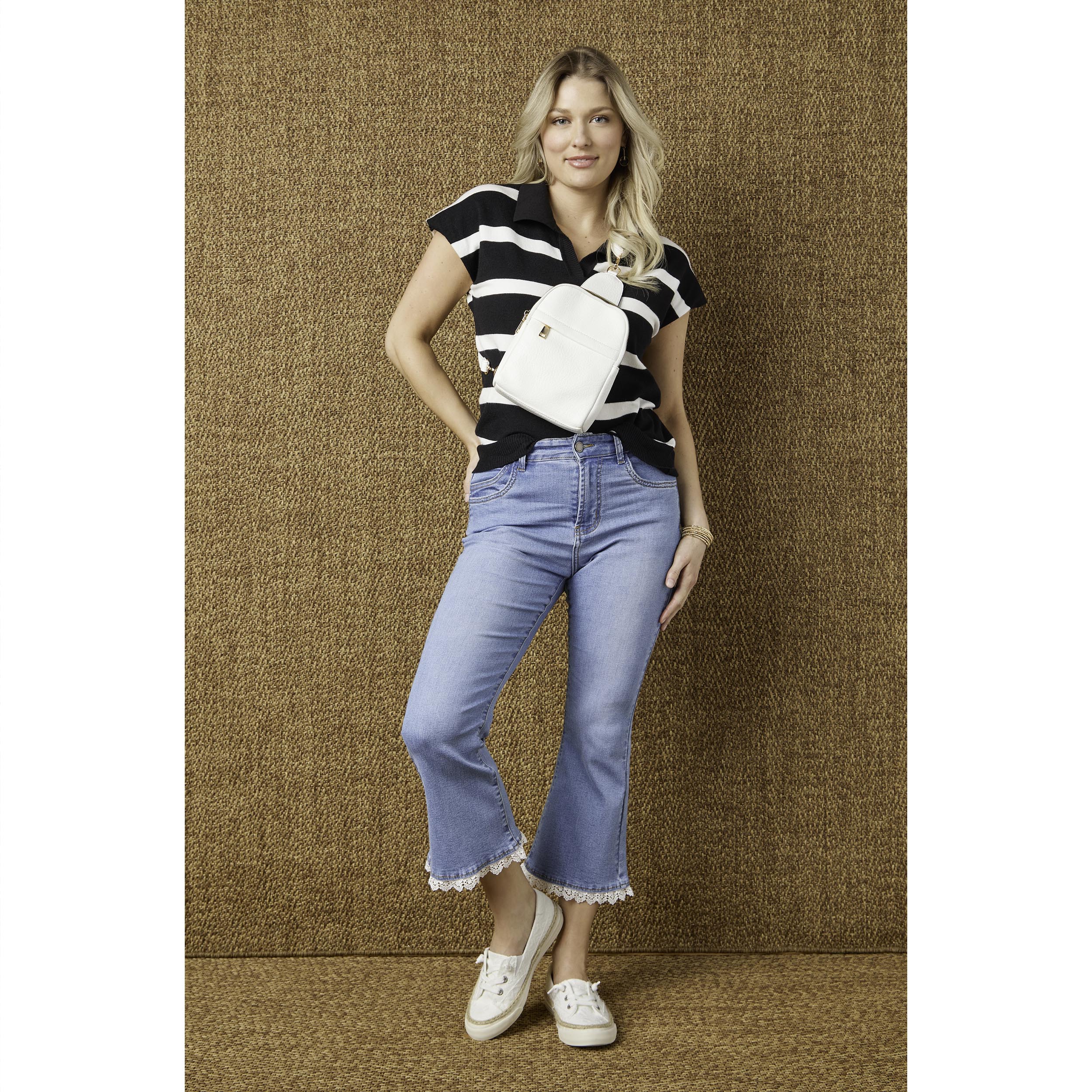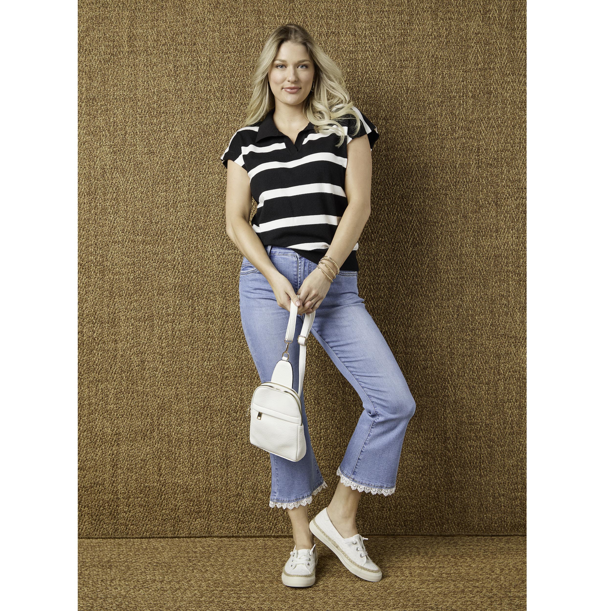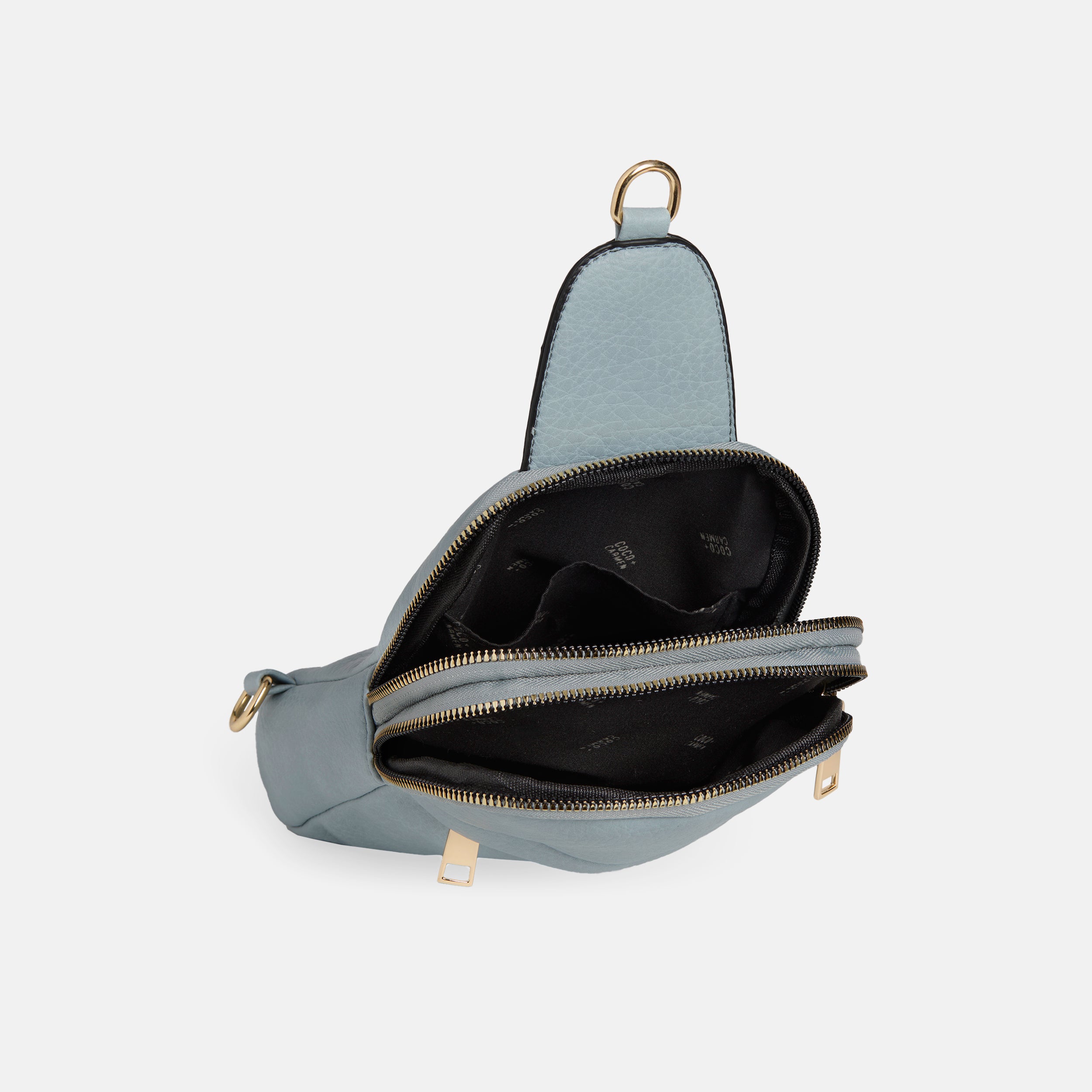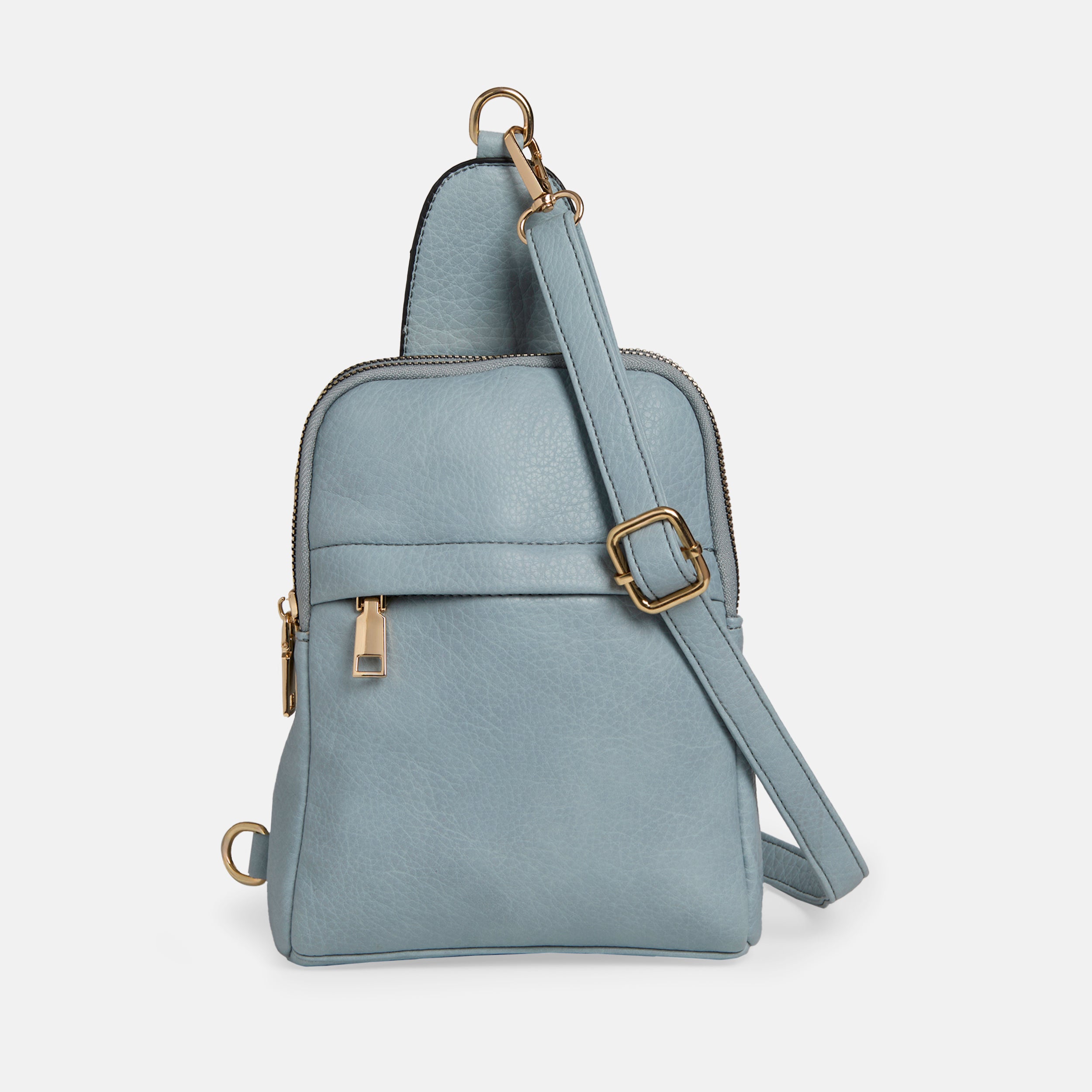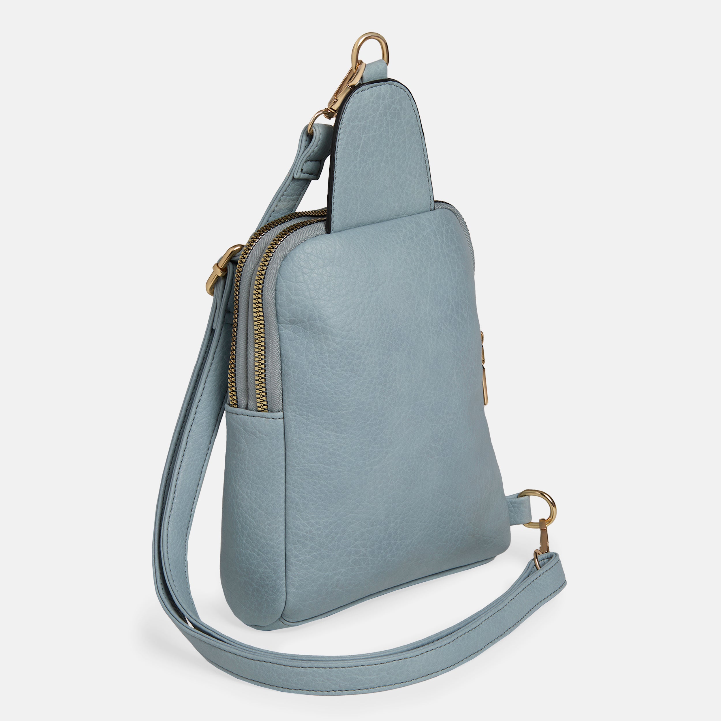 Sleek sling bag in a compact style, zip pocket on front with hidden zipper, top zip-around closure reveals double storage compartments, adjustable strap with lobster clasps. Perfect for travel.