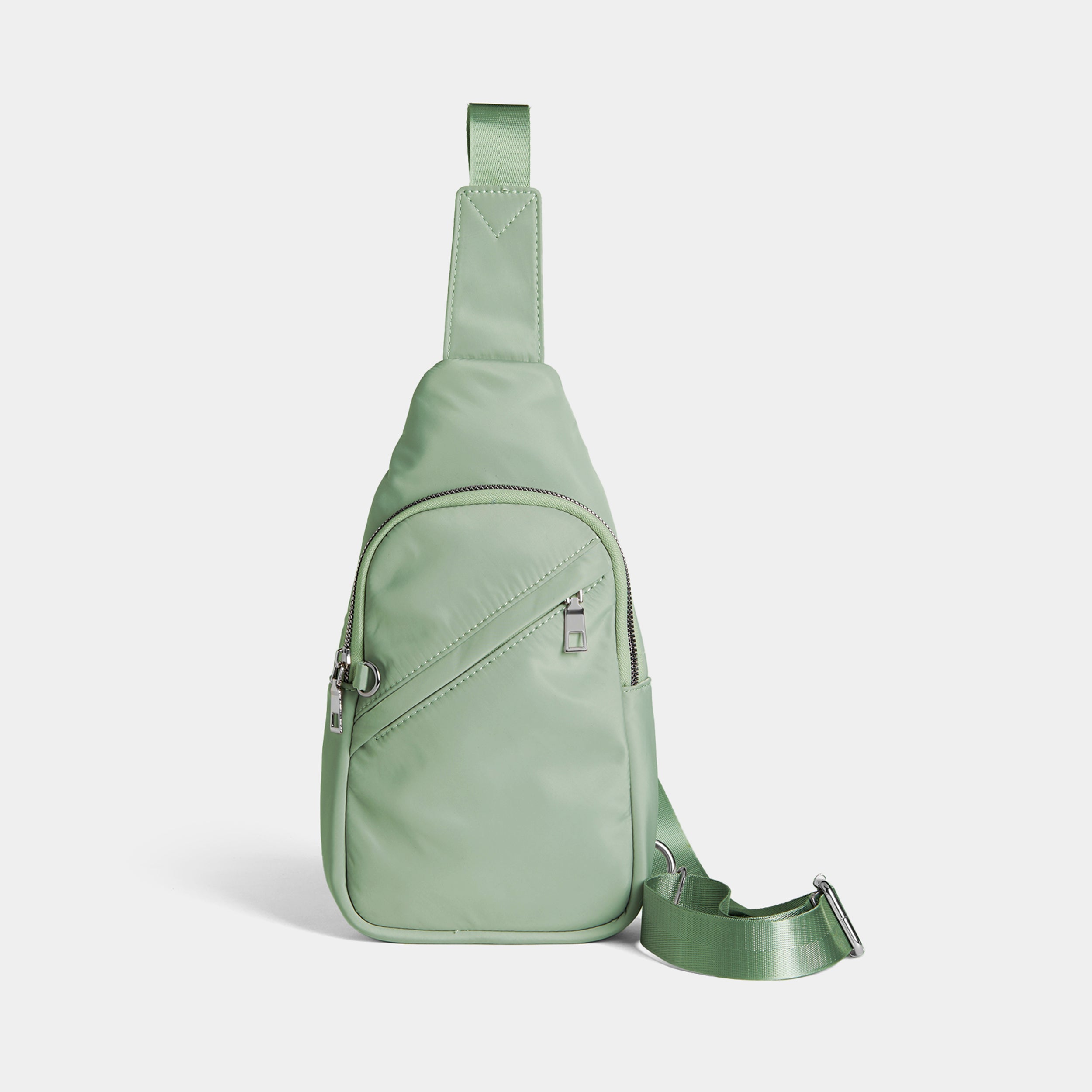 Cute and compact sling bag for life on the go, handy front pocket, interior large enough for essentials, built-in zip pocket, single adjustable strap, wear across the front or back. Metal hardware.