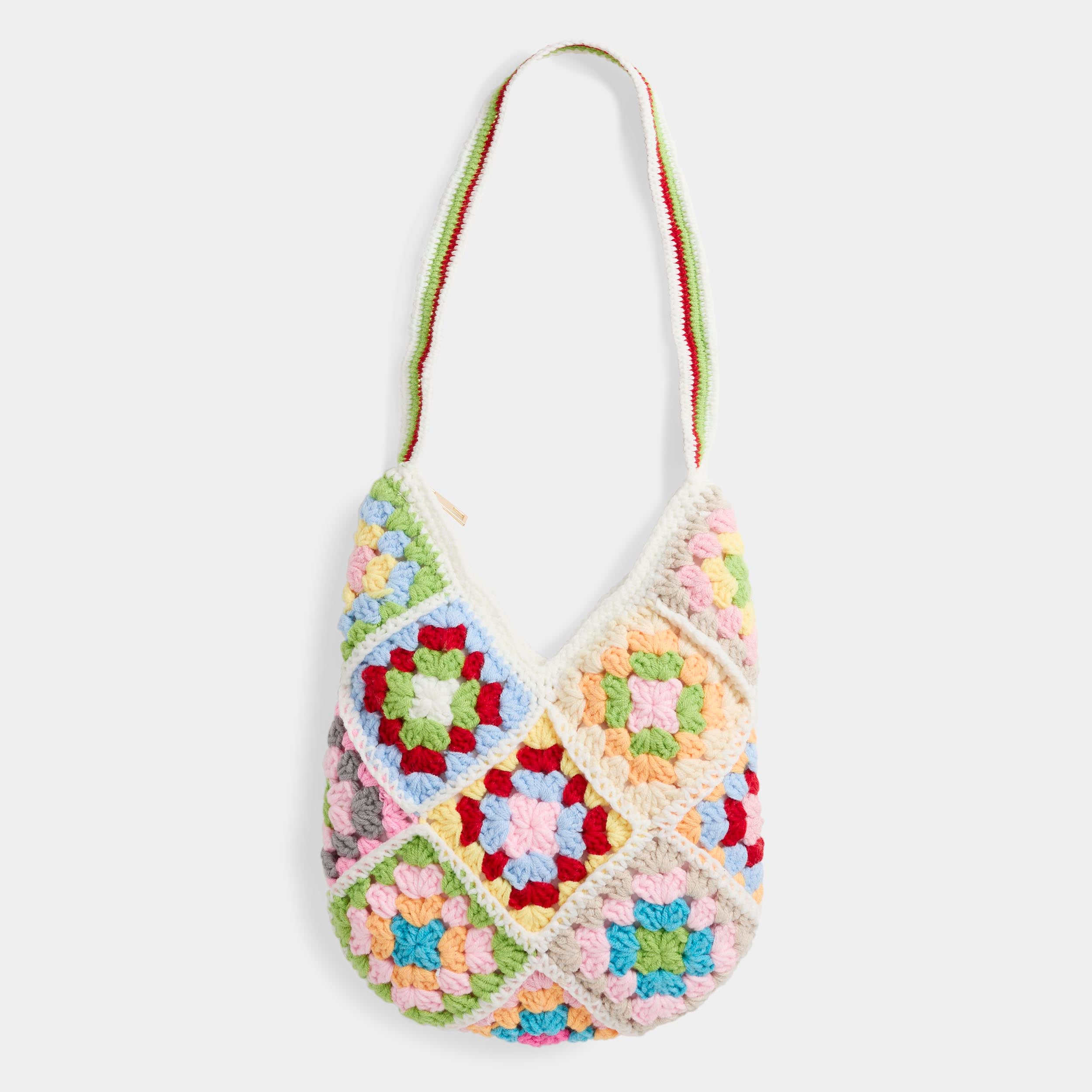 Nostalgia meets summer style in this colorful crochet shoulder bag, soft body with top zip closure, full-lined interior with built-in storage. Handmade. Colors and patterns shown may vary. Dimensions: 11"W x 12"H x .25"D.