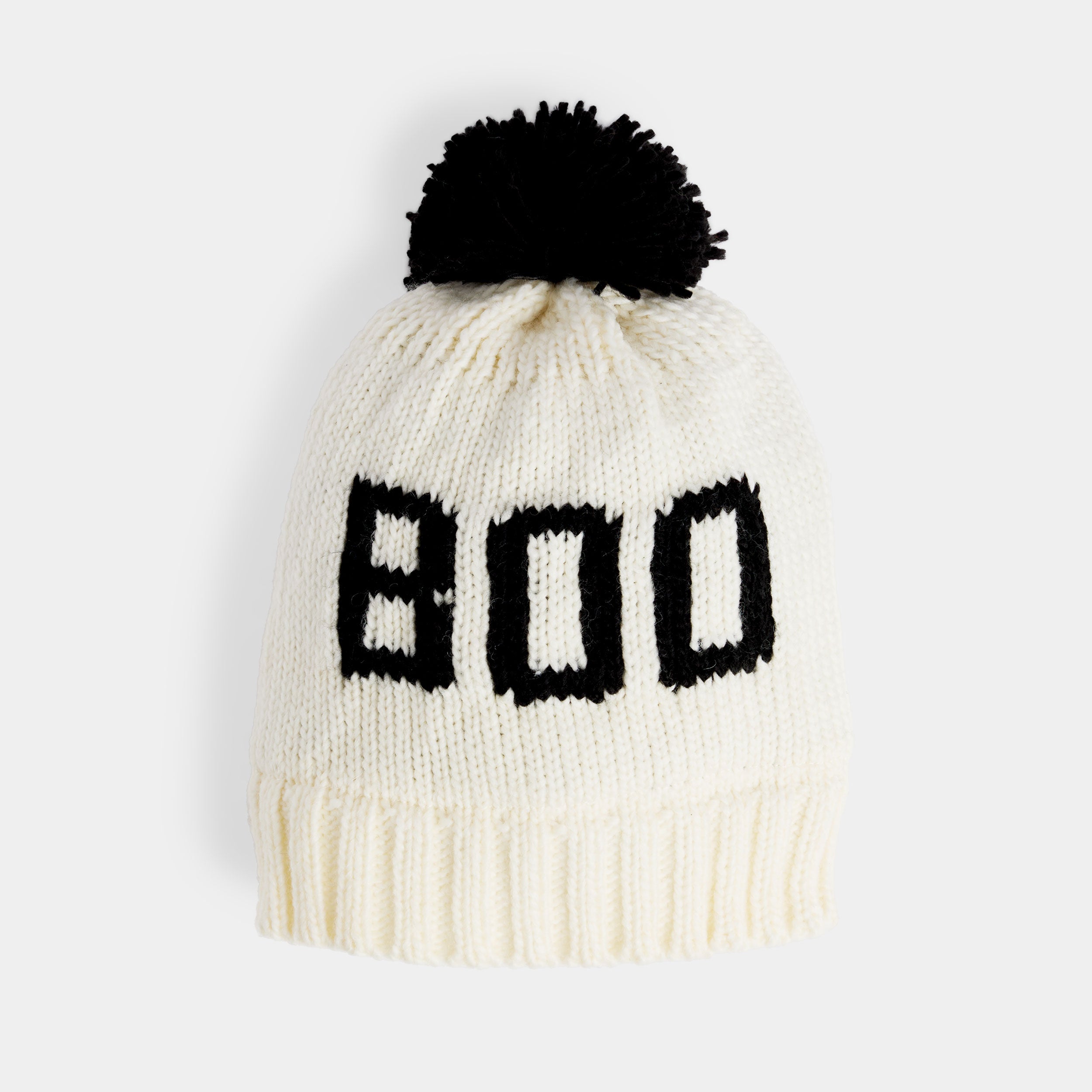 Stay warm and stylish this Halloween season with our Boo Knit Hat. This cozy hat is fleece lined to keep you comfortable on chilly evenings while you enjoy trick-or-treating or pumpkin carving with friends. Get in the spirit of the season with this spooktacular accessory! Materials: Acrylic, Polyester.