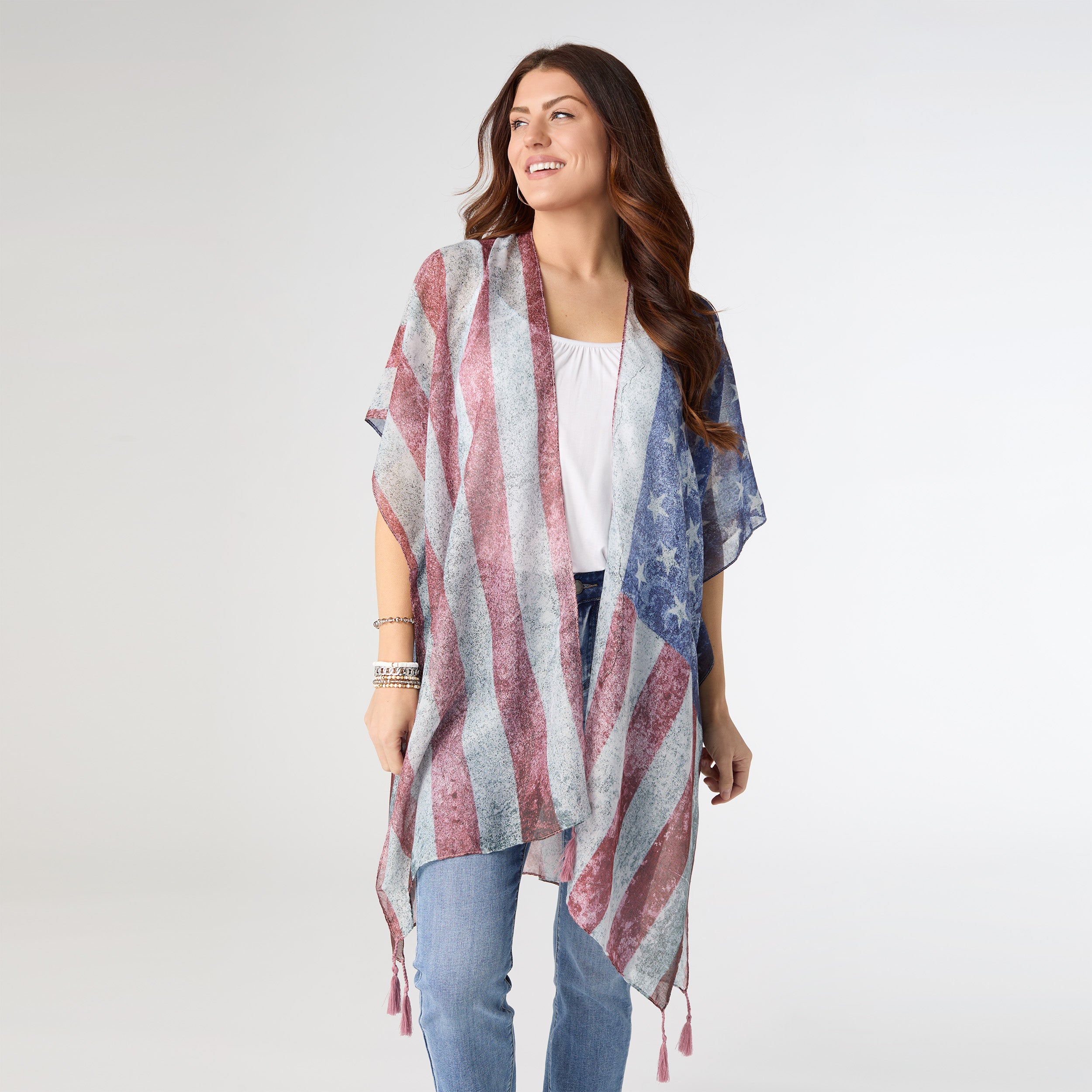 Get ready to show your patriotic spirit with this American Flag Wrap! Perfect for celebrating the 4th of July in style, this lightweight accessory is great for layering over your favorite outfit. Stand out and salute the red, white, and blue with this fun and festive wrap!