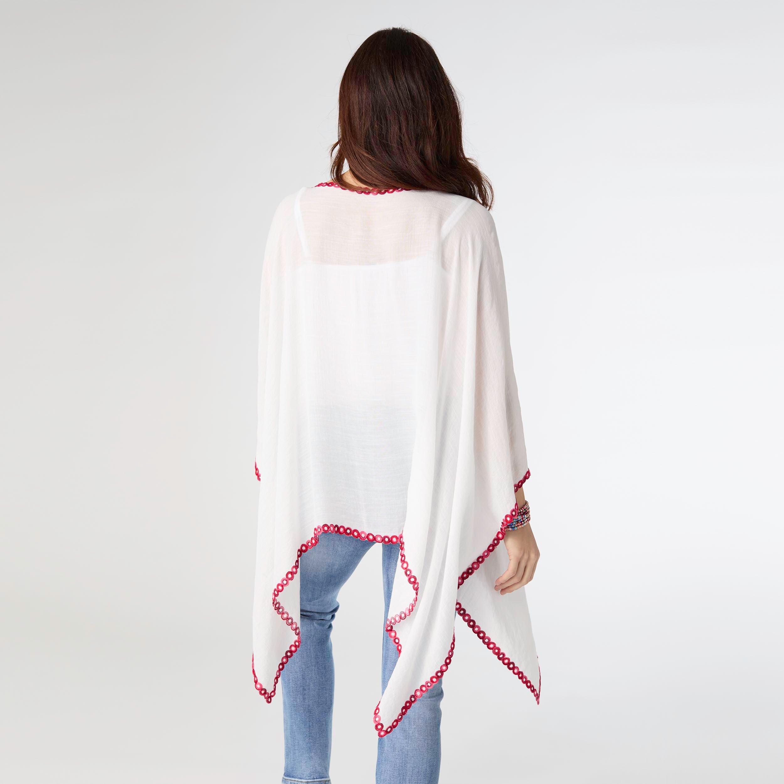 Elevate your look with our Riley V-Neck Poncho with Embroidery! Made from lightweight fabric, this poncho is perfect for layering without adding bulk. The intricate embroidery detail adds a unique touch to this classic silhouette. Whether you pair it with jeans and a t-shirt or a sleek dress, this poncho will effortlessly take your outfit to the next level.