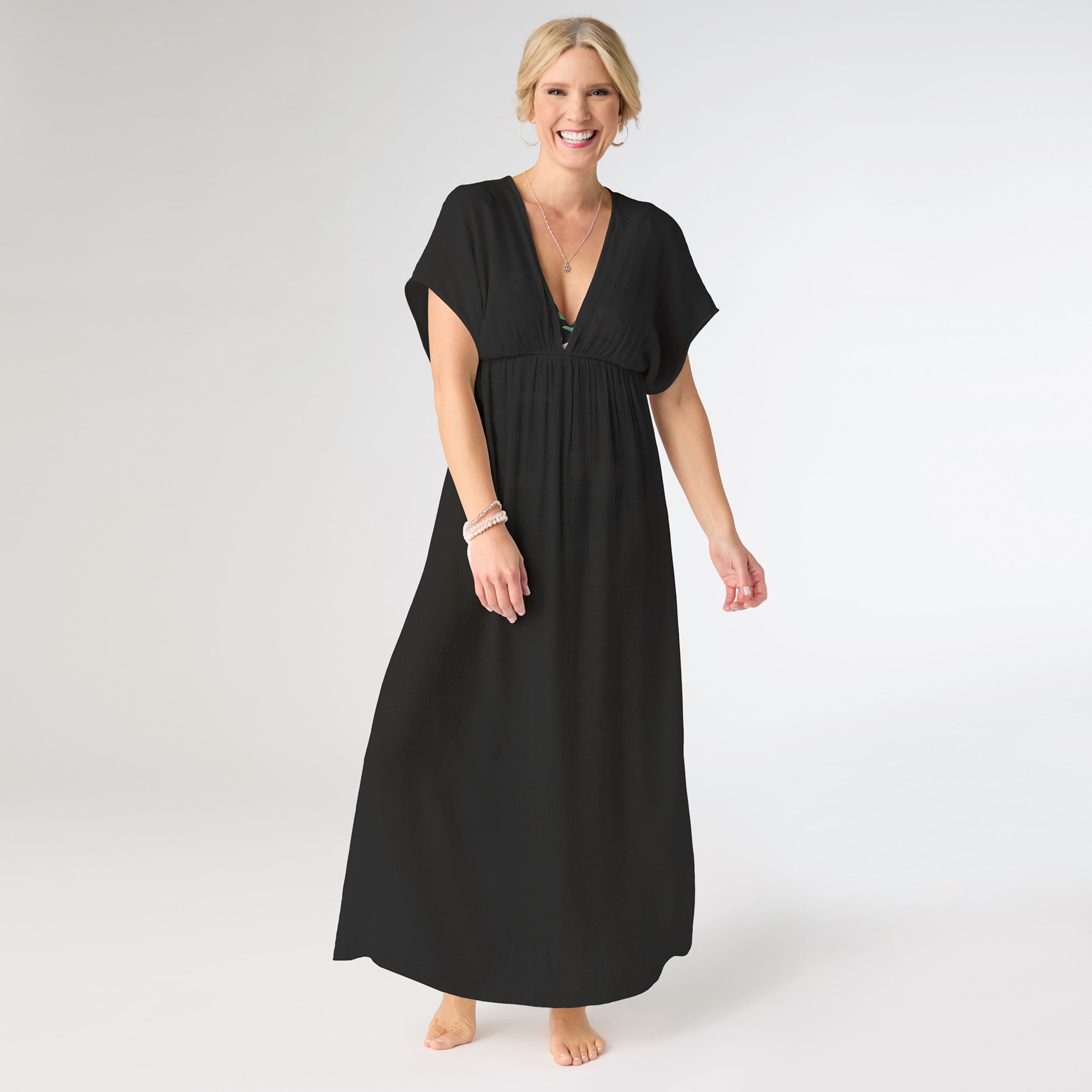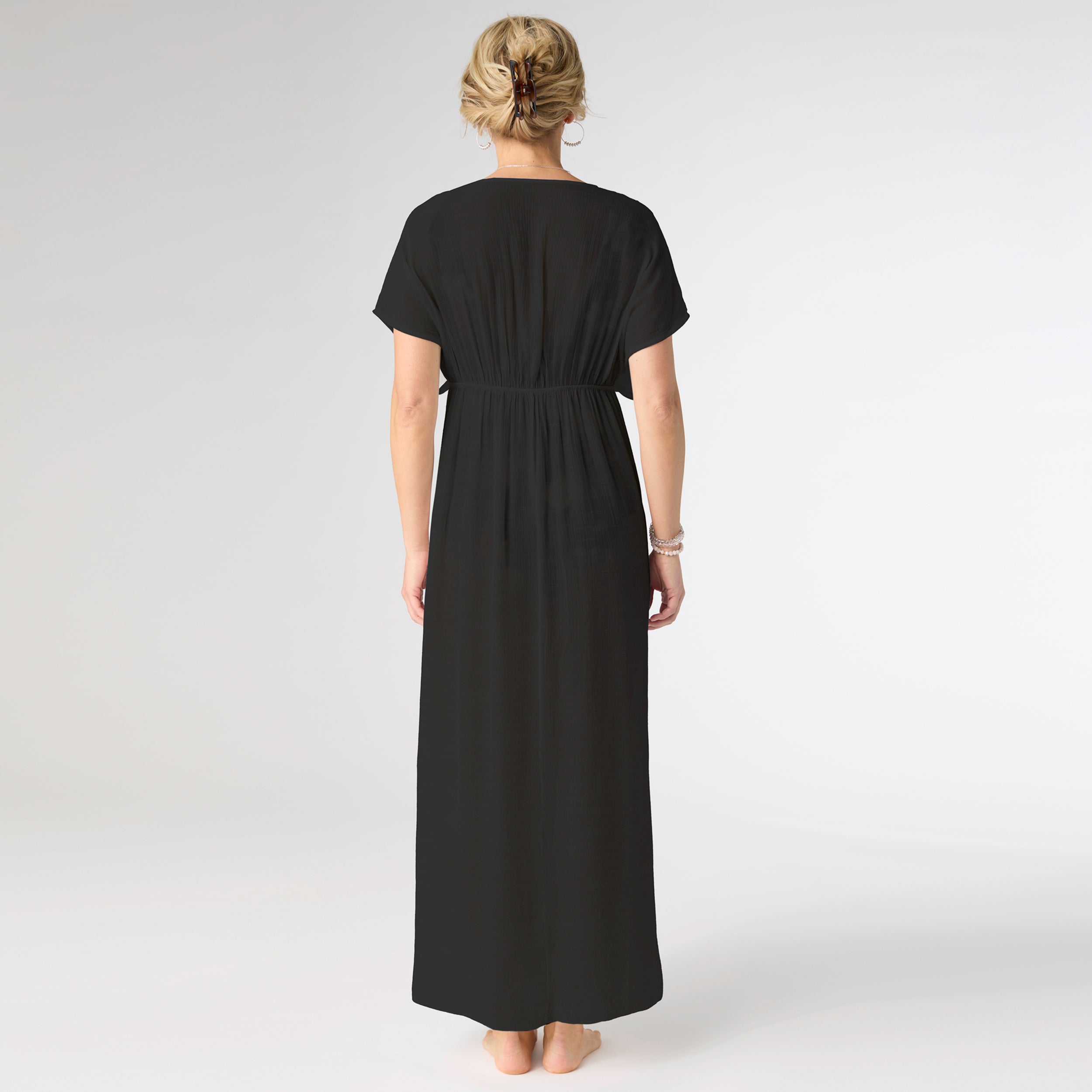 Elevate your beach look with our Scarlett Swim Cover-Up Long Dress. Made from lightweight fabric, this flowing cover-up will keep you cool and stylish as you lounge by the water. Its chic design and flattering silhouette make it a must-have for your next vacation.