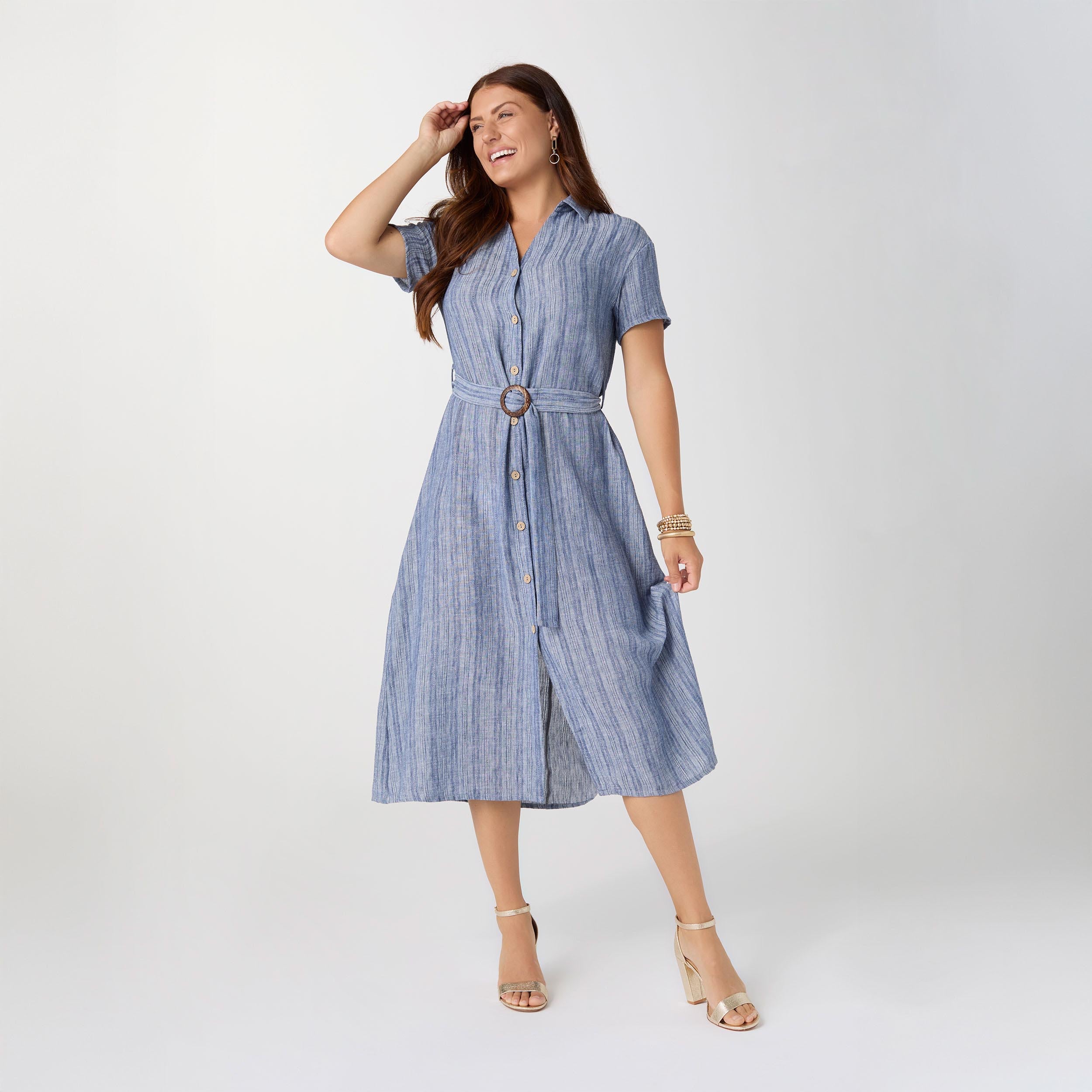 Effortless polish meets everyday comfort in the Miriam Short Sleeve Shirtdress with Belt. Designed with a classic button-front silhouette and short sleeves, this dress features a softly structured shape that feels both relaxed and refined. A removable belt cinches the waist for a flattering fit, while the lightweight fabric makes it perfect for warm-weather wear. Easy to style with sandals or wedges, it transitions seamlessly from casual days to more dressed-up occasions.