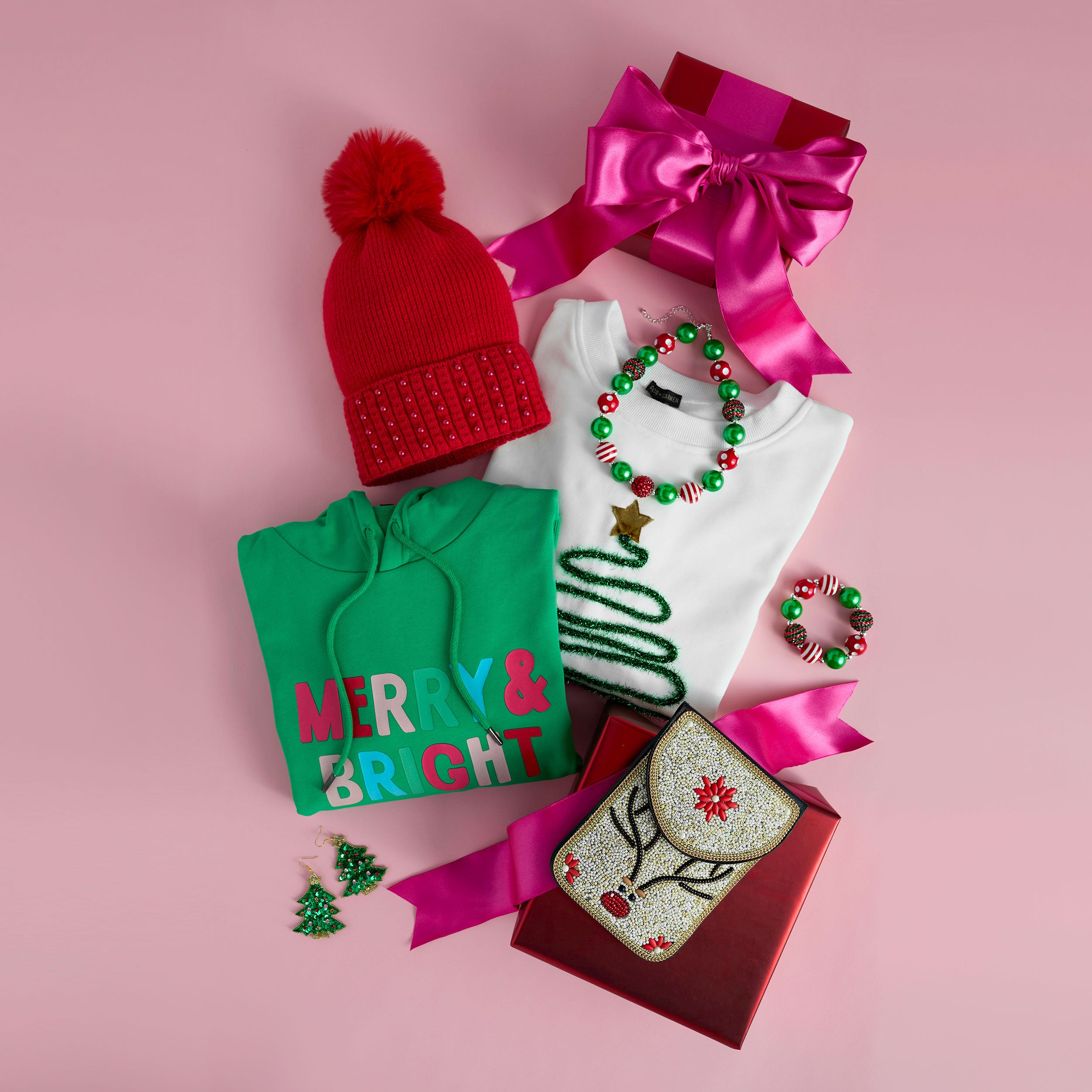 'Tis the season to be jolly in our Merry & Bright Hooded Sweatshirt! Embrace the holiday spirit with this fun and cheerful sweatshirt, guaranteed to bring a smile to everyone you meet. Perfect for decking the halls or simply snuggling up with a good book.