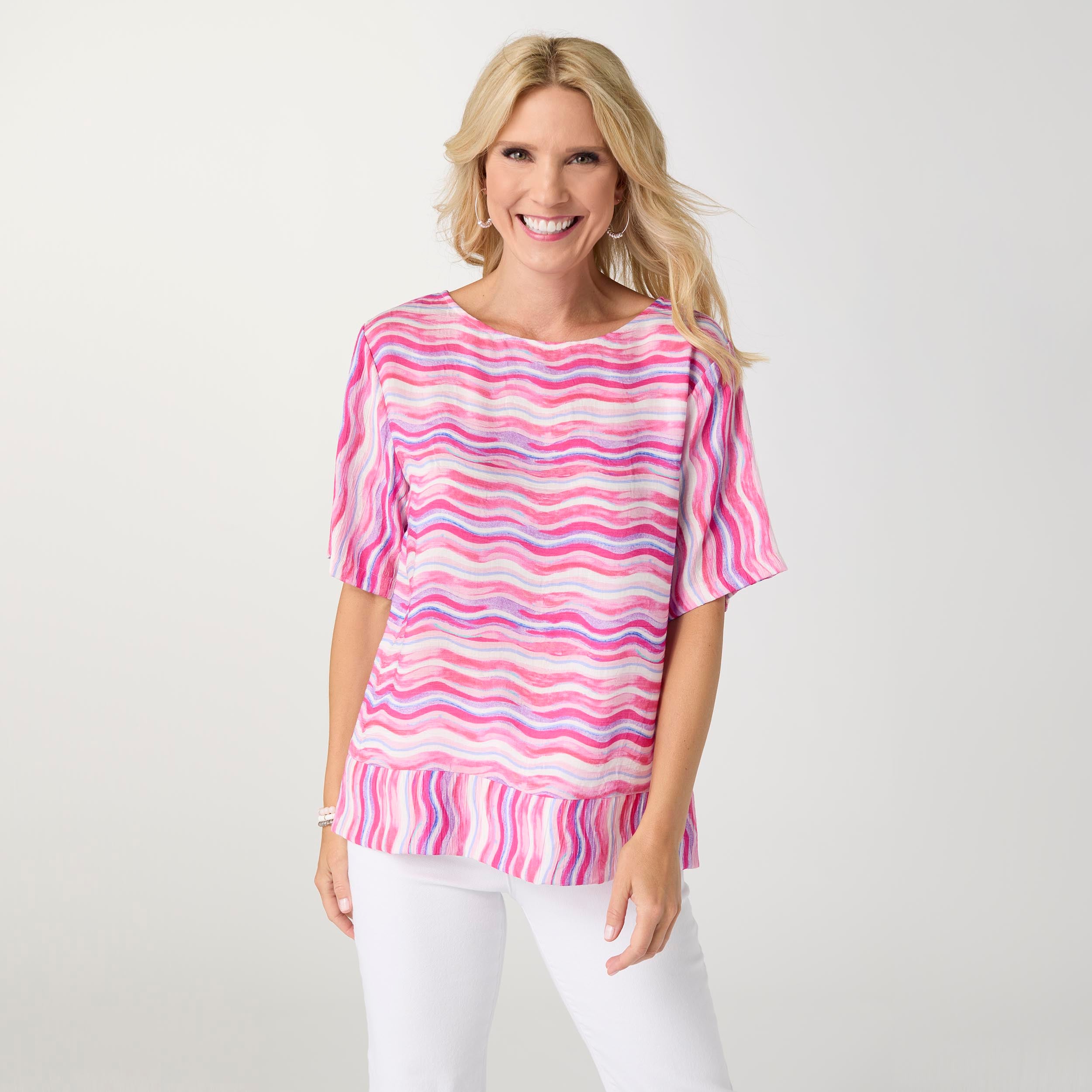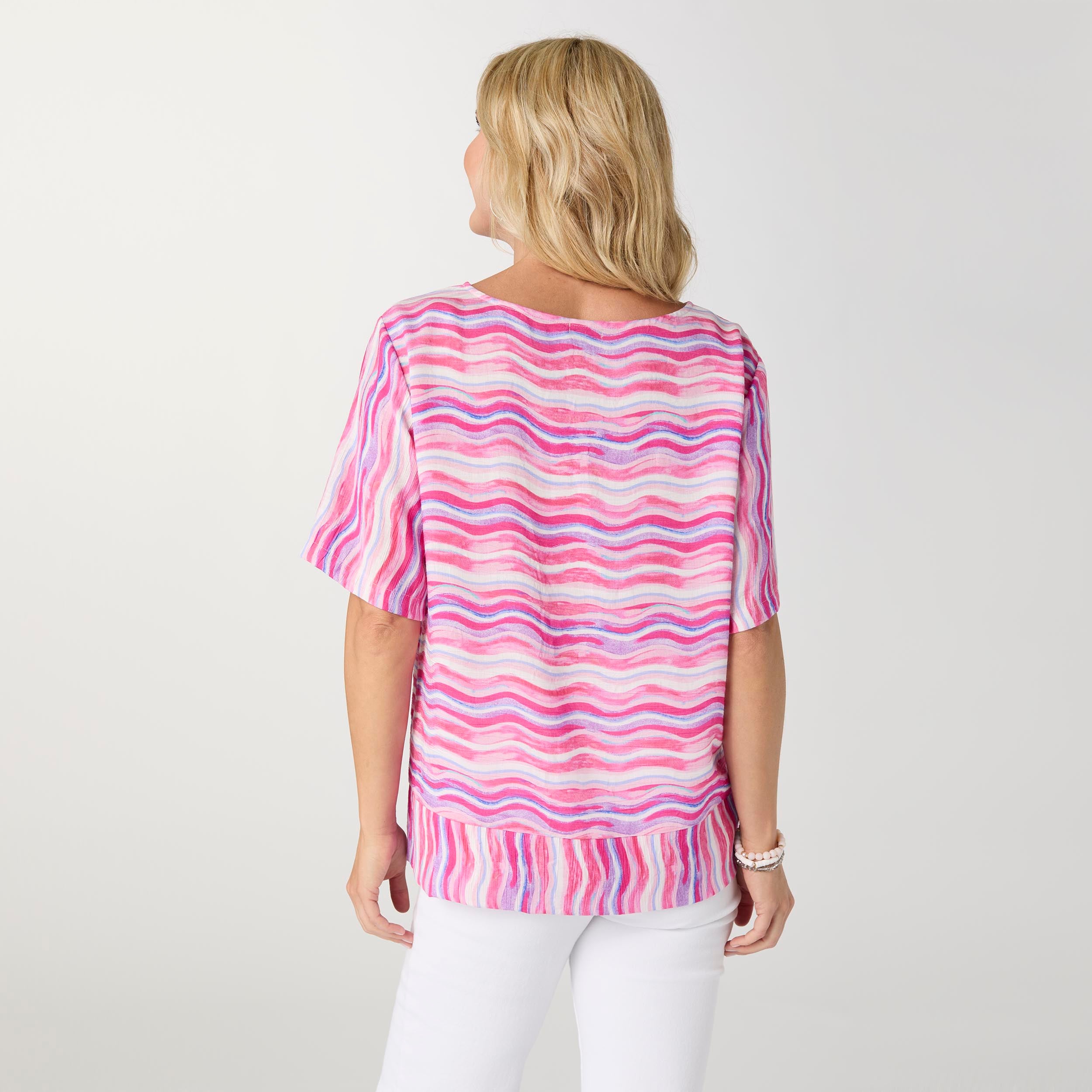 Artful pattern and easy structure come together in the Luciana Banded Bottom Top. Designed with an eye-catching wavy stripe print, this top features a relaxed silhouette finished with a banded hem for a polished, stay-put fit. Lightweight and comfortable, it's perfect for everyday wear and pairs effortlessly with denim, trousers, or skirts for a look that feels both playful and pulled together.