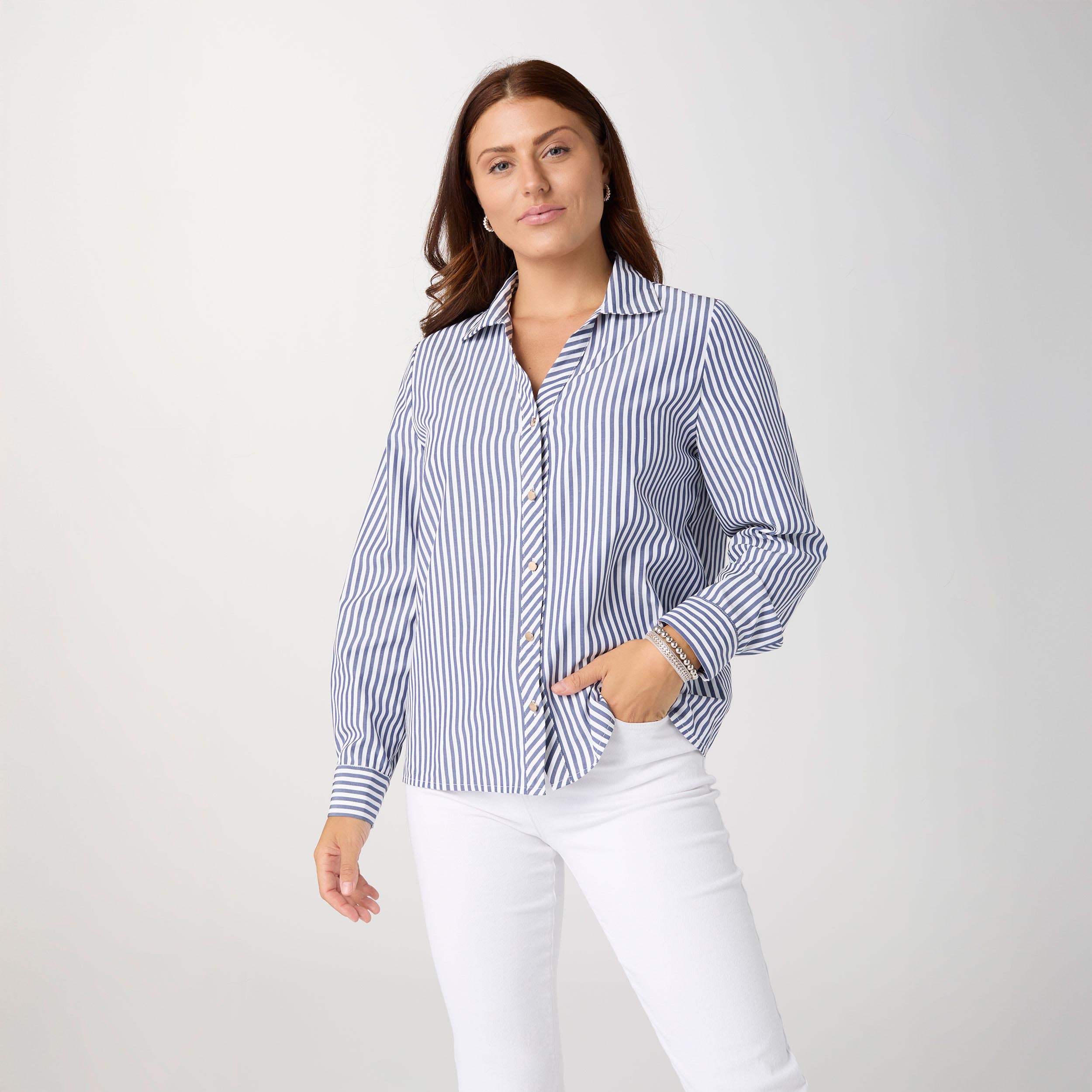 The Mabel Long Sleeve Striped Button Front Top is a timeless wardrobe staple with a polished, modern feel. Designed with a classic button-front silhouette and vertical stripe pattern, this top offers a flattering, easy fit that feels both relaxed and refined. Long sleeves add versatile coverage, making it perfect for workdays, casual outings, or effortless everyday styling. Pair it with denim, trousers, or cropped pants for a clean, put-together look.