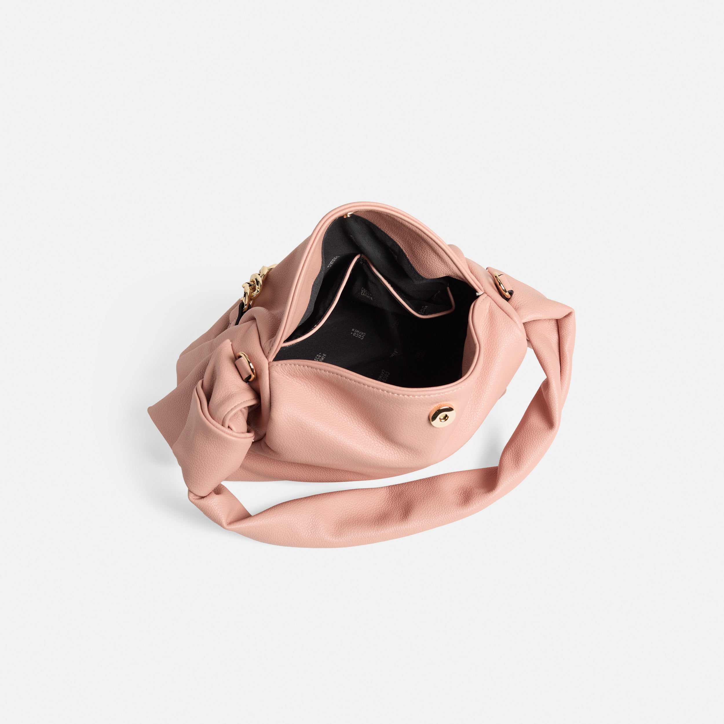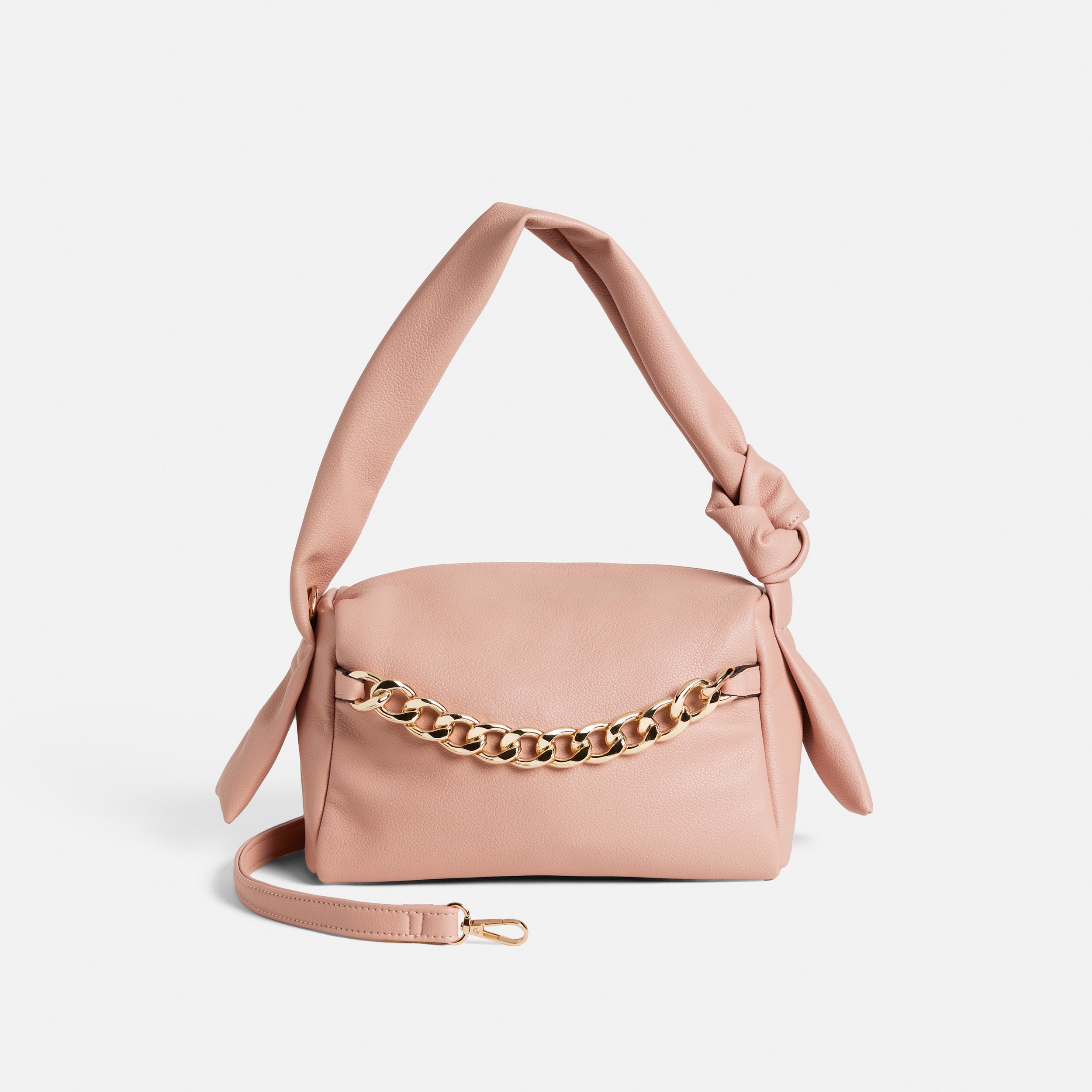 Curved edges and soft vegan leather makes this tote unique, decorative chain link on the front and knotted top handle, fold and snap top closure, spacious interior with storage and detachable strap.